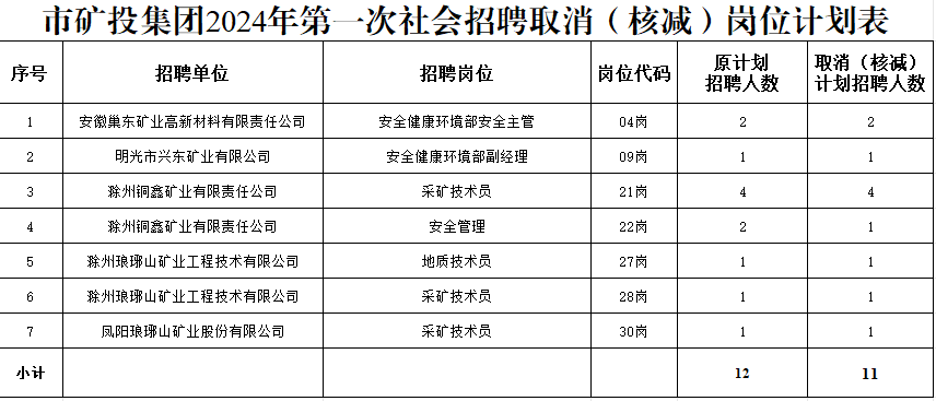 根據(jù)《滁州市興滁礦業(yè)投資集團(tuán)有限公司2024年第一次社會(huì)招聘公告》規(guī)定,經(jīng)對(duì)各崗位報(bào)名情況篩查審定,結(jié)合資格復(fù)審情況,部分崗位報(bào)名情況未達(dá)到開(kāi)考比例,經(jīng)研究決定取消(核減)以下崗位招聘計(jì)劃: