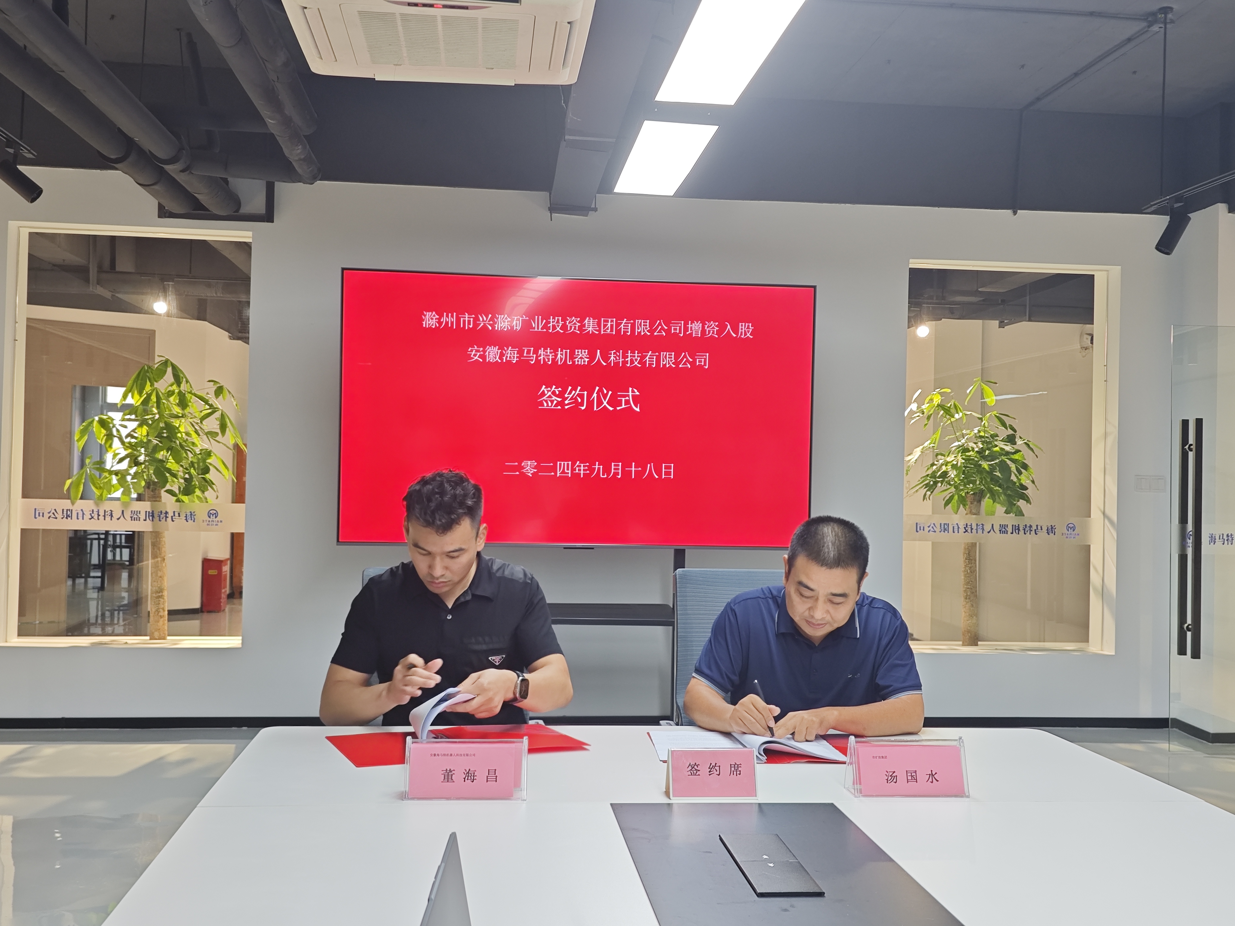 9月18日下午,市礦投集團(tuán)增資入股安徽海馬特機(jī)器人科技有限公司簽約儀式在天長(zhǎng)市舉行。市礦投集團(tuán)黨委委員、副總經(jīng)理湯國(guó)水出席簽約儀式并講話,天長(zhǎng)市科技局、滁州市創(chuàng)新驅(qū)動(dòng)發(fā)展研究院、中國(guó)科學(xué)技術(shù)大學(xué)火災(zāi)科學(xué)國(guó)家重點(diǎn)實(shí)驗(yàn)室等相關(guān)部門負(fù)責(zé)人參加本次簽約儀式。